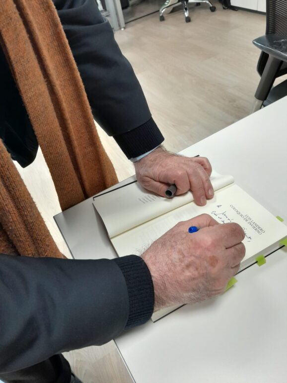 Y hablamos de los personajes y cuya condición profesional de cada uno marca su particular identidad y su decantación retórica: el profesor que le gusta seducir, y no ir más allá, porque lo que le gusta es el cortejo y como es profesor seduce a las alumnas y “ahí entramos en un terreno resbaladizo porque está utilizando su autoridad para para seducir, pero crea expectativas y él cree que no tiene mayor importancia hasta que aparece hasta que aparece el movimiento feminista y empieza a llenarse de miedos”; En El hombre que perdió un mechero y encontró un perro, hay una escena muy hermosa: un niño enciende le enciende un cigarrillo al padre con el mechero de este. Es un momento fundacional clave de la vida del niño; En Verano del 69. hay por ahí una experiencia autobiográfica: Un personaje se llama Leandro, anagrama de Landero, que es guitarrista flamenco como lo fue él. Es que el humor irónico de este gran escritor brilla en toda su obra. En Historia de un instante, unas palabras dichas por un borracho al oído del protagonista sugiriendo algo sobre su mujer, es una grieta que hace que el edificio de esa relación se derrumbe… Luis Landero ha escrito esta novela en estado de gracia, ha creado una espléndida colección de historias narradas por los personajes de esta novela durante cuatro días de aislamiento. El invierno, en este sentido, no es solo una circunstancia externa, sino un estado vital compartido. Los personajes hablan desde una cierta conciencia de final, de cierre.
